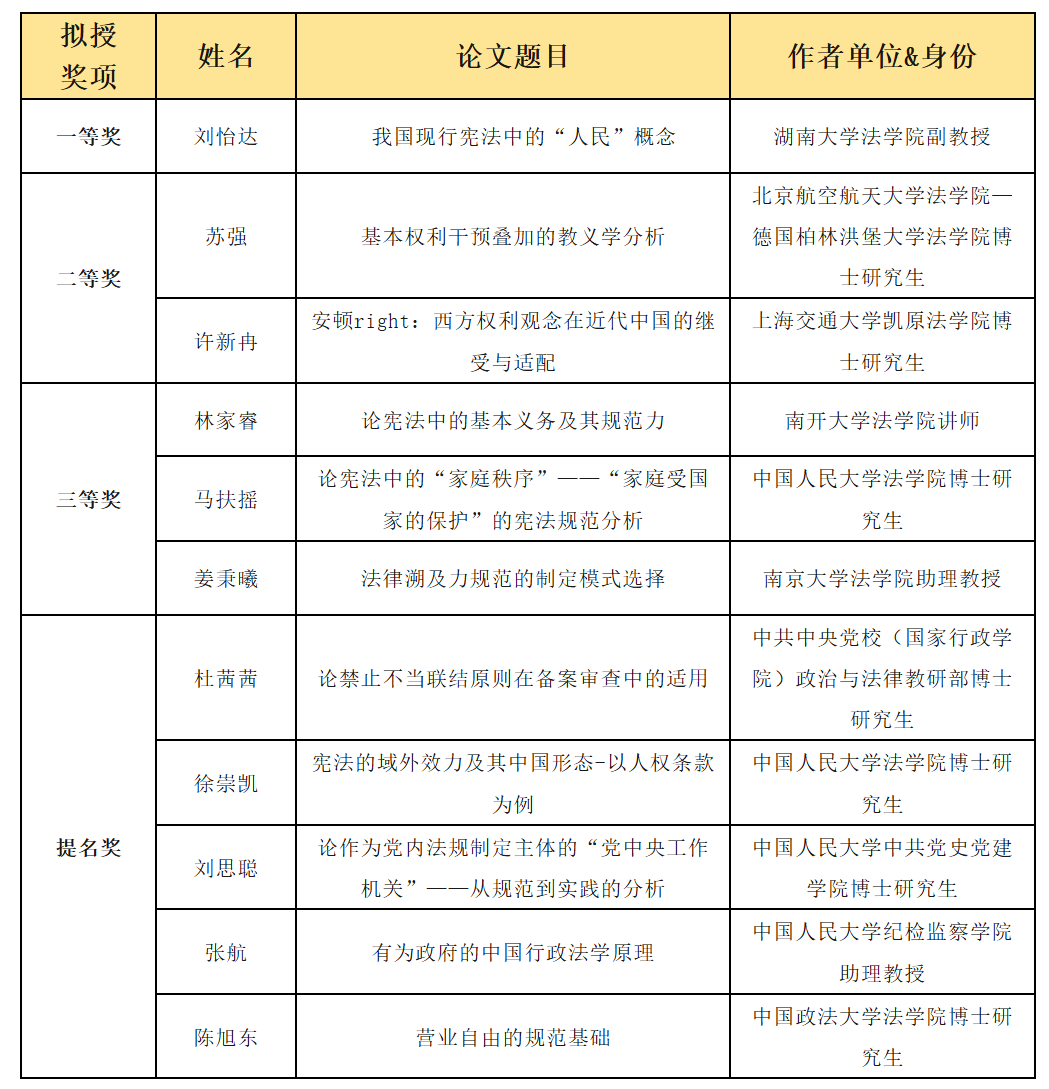 本次征文活动自5月5日启动,10月7日截止,共收到申请论文191篇。经严格的匿名初审和匿名终审,最终评选出11篇论文,授予“蔡定剑宪法学优秀论文奖”,其中一等奖1名、二等奖2名、三等奖3名,提名奖5名。