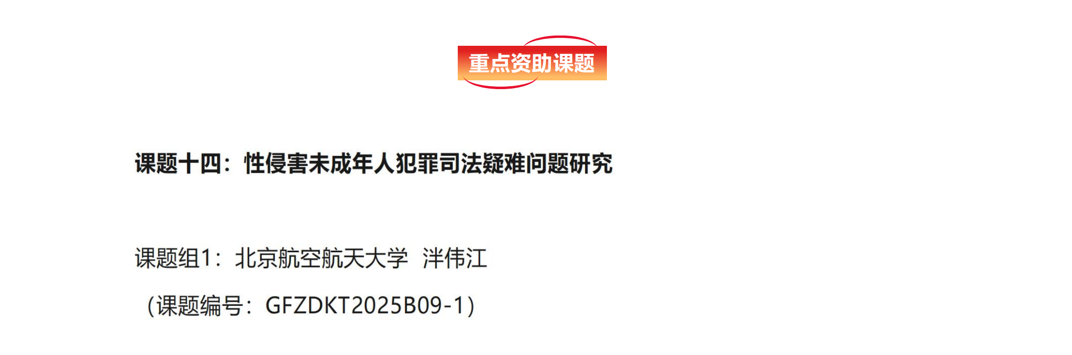 近日,最高人民法院2025年度司法研究重大课题立项结果正式公布。北京航空航天大学法学院院长、少年司法研究基地执行主任泮伟江教授作为主持人申报的课题“性侵害未成年人犯罪司法疑难问题研究”获得重点资助课题立项。