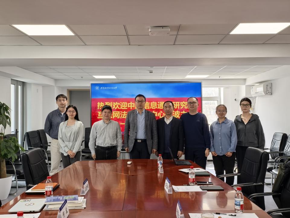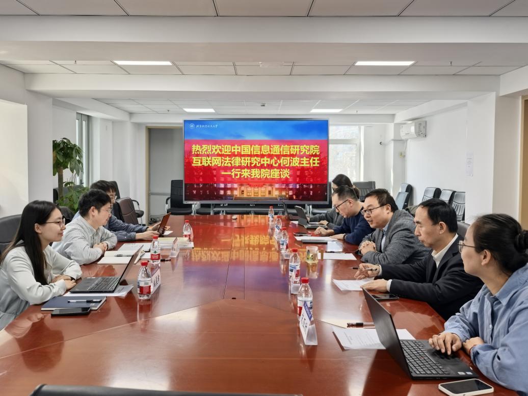 2026年3月16日,中国信息通信研究院互联网法律研究中心何波主任一行来我院进行调研座谈,北航法学院院长泮伟江教授、副院长周学峰教授、院务委员吉冠浩副教授、教务办主任宋亚欣老师、教务秘书姚奇老师参加座谈。座谈会由院务委员吉冠浩副教授主持。